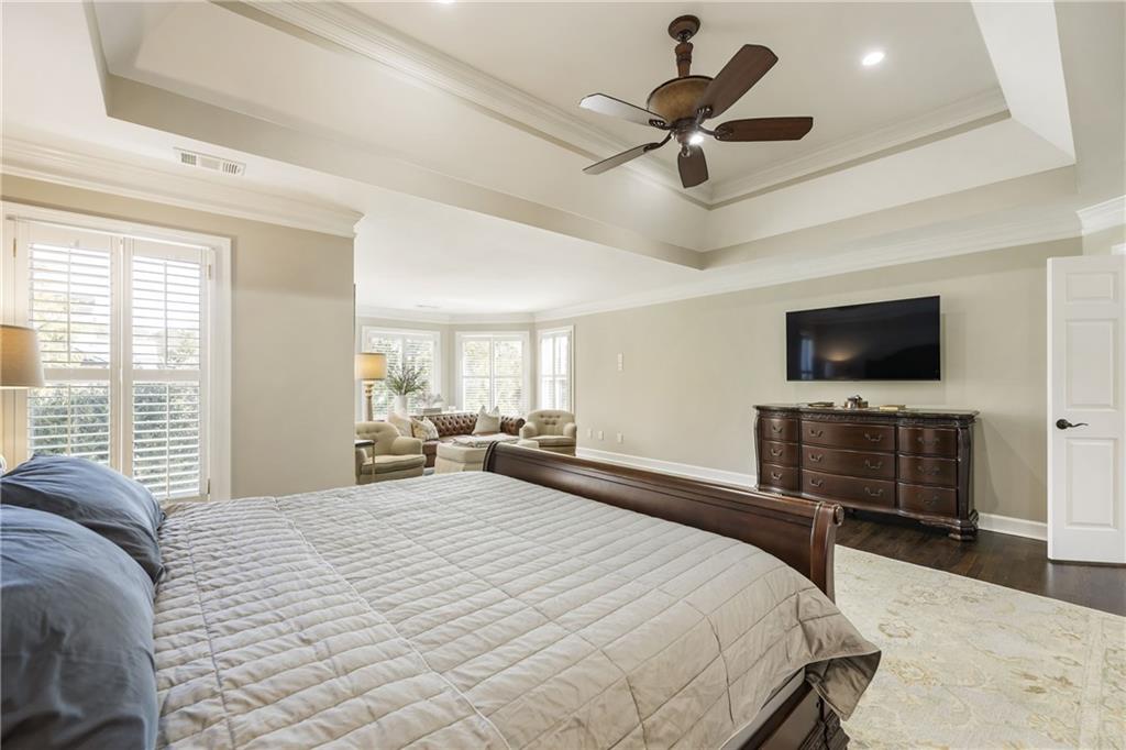 Check out this exquisite home in Wellington Lake, Peachtree Corners, offering a resort-style pool & backyard! This stunning 4-sided brick home offers exceptional curb appeal with immaculate landscaping and charming paver walkway to the grand double-door entrance. Step inside to an impressive two-story foyer, featuring a striking palladium window and an elegant split staircase. Gleaming refinished hardwood floors and an abundance of natural light set the tone for the inviting and sophisticated interior. To the right, a formal sitting and music room provide a refined retreat, while the dining room to the left welcomes guests for special occasions. The great room captivates with soaring two-story windows, a fireplace framed by custom built-ins, and views of the expansive deck. The kitchen is designed for both beauty and function, boasting a central island perfect for entertaining, a corner sink with double windows, tons of cabinetry, and generous counter space. A convenient side entrance leads to the laundry area, complete with storage cabinetry, a sink, and organized space for coats, gear, and backpacks. A private guest suite with a full ensuite bath completes the main level. Upstairs, the oversized primary suite is a serene retreat with a double tray ceiling and a sunlit sitting alcove overlooking the stunning backyard. The spa-like ensuite bath features double vanities, a large seamless glass shower, and a soaking tub. The walk-in closet is truly exceptional--one of the largest you'll find, with custom built-in shelving, dressers, a vanity, and a window for natural light. Additionally, the upper level includes a secondary bedroom with its own ensuite bath, plus two more bedrooms with vaulted ceilings that share a Jack and Jill bath. The fully finished terrace level is designed for entertainment and relaxation, featuring a media room with built-ins and a kitchenette, an additional bedroom with a full bath, an office, flex space, and an exercise room with mirrored walls. The media room opens to a weather-protected covered porch with a built-in sound system, making it the ultimate spot for poolside gatherings. The backyard is a private resort-like paradise, perfect for year-round enjoyment. A heated PebbleTec pool, hot tub with a cascading waterfall, and travertine tile decking create a luxurious escape. Gorgeous hardscaping, a firepit, premium artificial turf, and wrought iron style fencing complete this breathtaking outdoor oasis. The Atlanta Athletic Club, new Intuitive campus, Wesleyan, fine dining and shopping are just minutes away. This exceptional home combines elegance, comfort, and resort-style living in the heart of Peachtree Corners--truly a must-see!